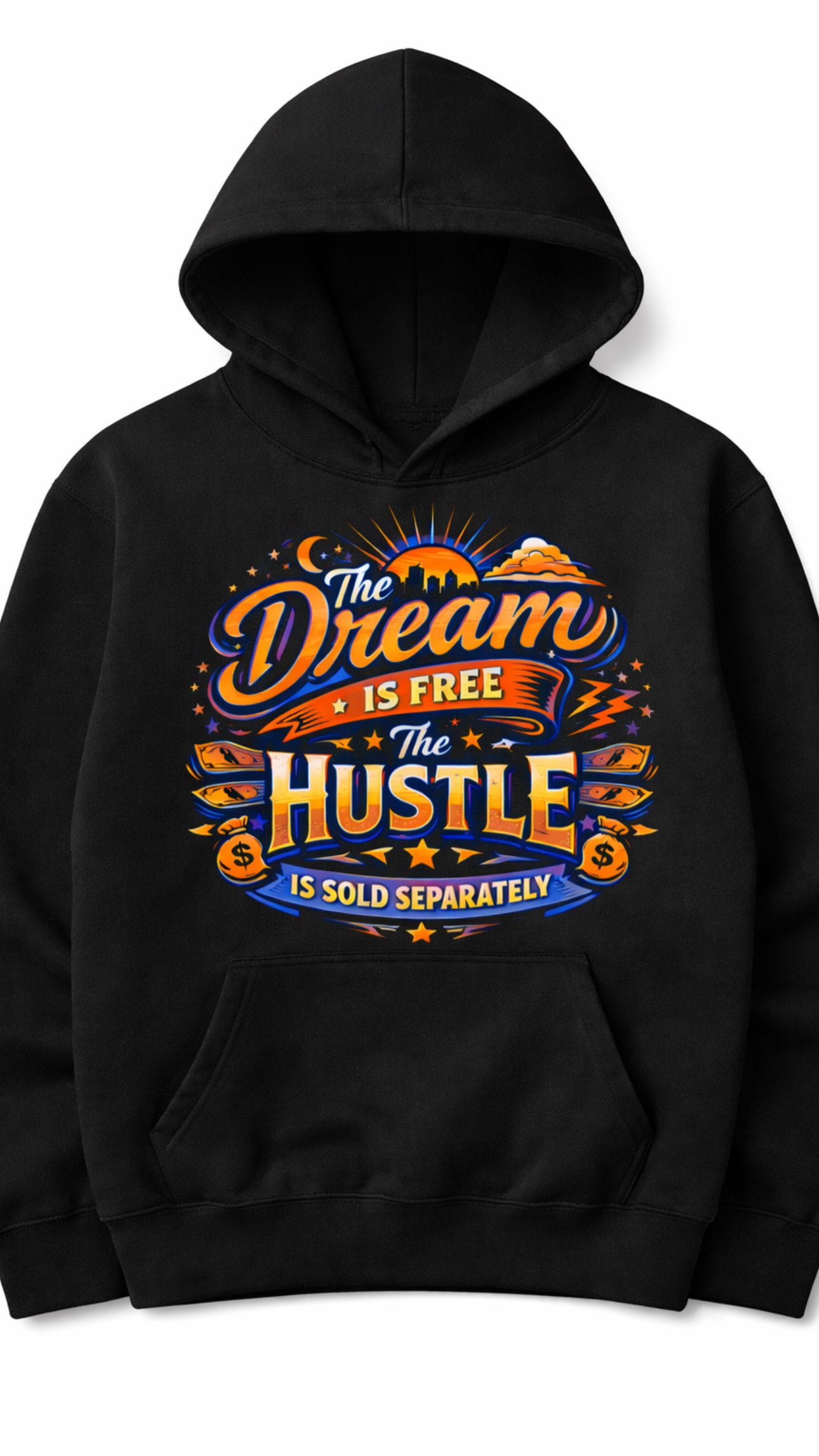 Black Hooded Sweater with Graphic Logo design: The Dream is Free, The Hustle is Sold Separately (Alternate Art style)